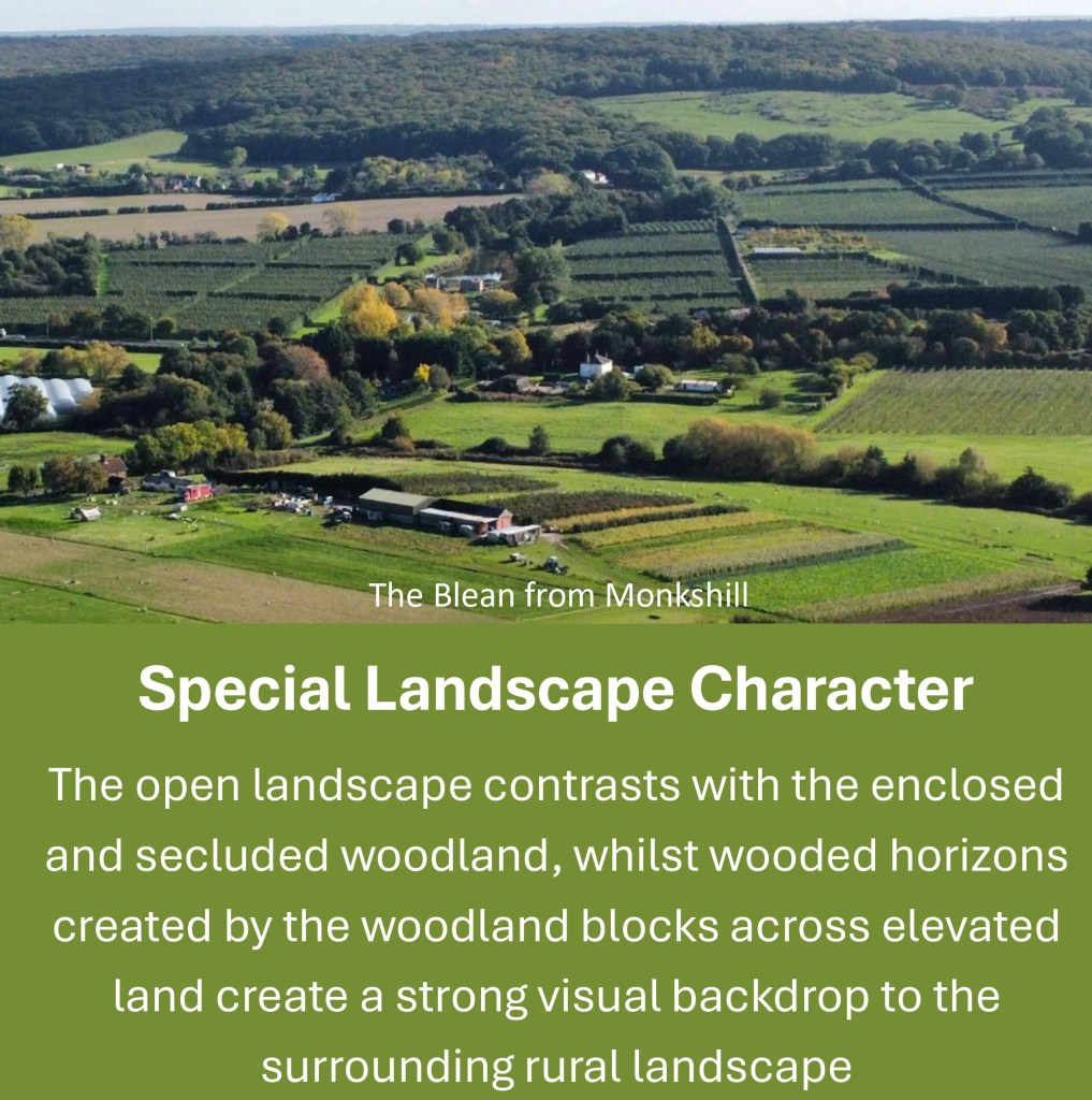 Open areas of grassland and heathland clearings, rides and glades provide important habitats and an open landscape, contrasting with the enclosed and secluded woodland, whilst wooded horizons created by the woodland blocks across elevated land create a strong visual backdrop to the surrounding rural landscape of orchards, arable farmland and grazed pasture. Beyond the wooded areas, the pattern of fields, hedgerows and occasional small woodland is characteristic of the agricultural landscape, with a coherent field pattern including the remnants of Medieval enclosures.